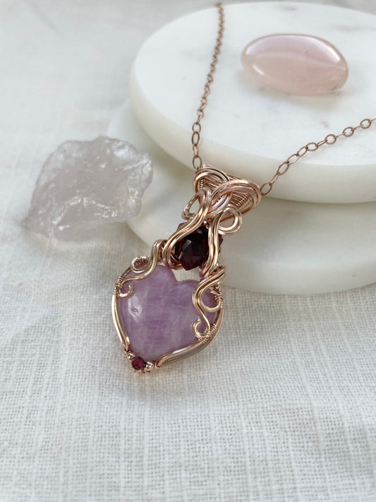 Kunzite heart & Garnet Necklace in 14k Rose Gold Filled