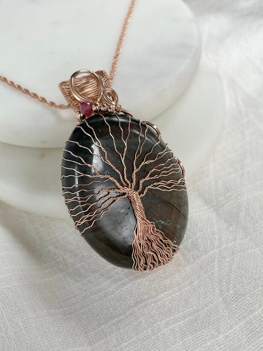 Labradorite & Pink Tourmaline Tree of Life Necklace in 14k Rose Gold Filled