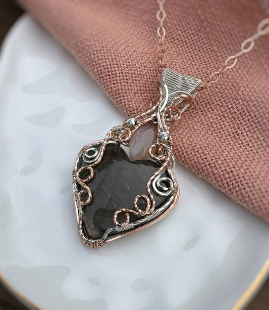 Labradorite Heart & Moonstone Necklace in Mixed Metals (14k Rose Gold Filled & Sterling Silver)