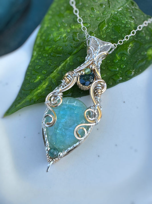 Milky Aquamarine, Teal Kyanite, Peridot & Aqua Apatite Necklace in Argentium Silver & 14k Gold Filled