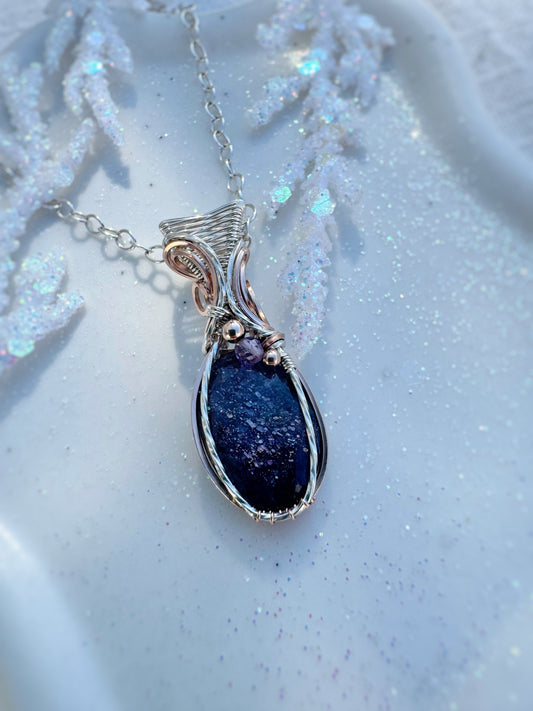 Rare Dumortierite in Clear Quartz, Blue Chalcedony & Amethyst Necklace in 0.925 Sterling Silver