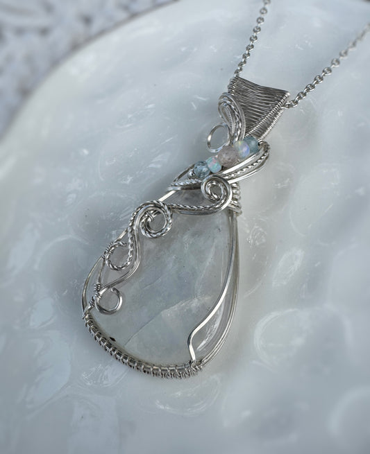 Rainbow Moonstone, Morganite, Aquamarine & Opal Necklace in Argentium Silver
