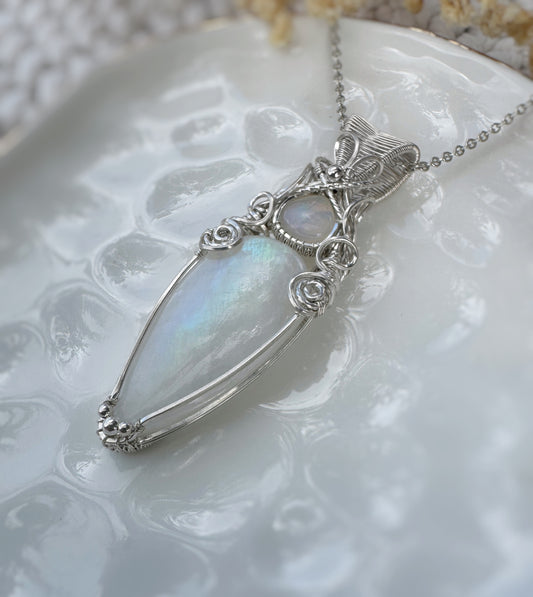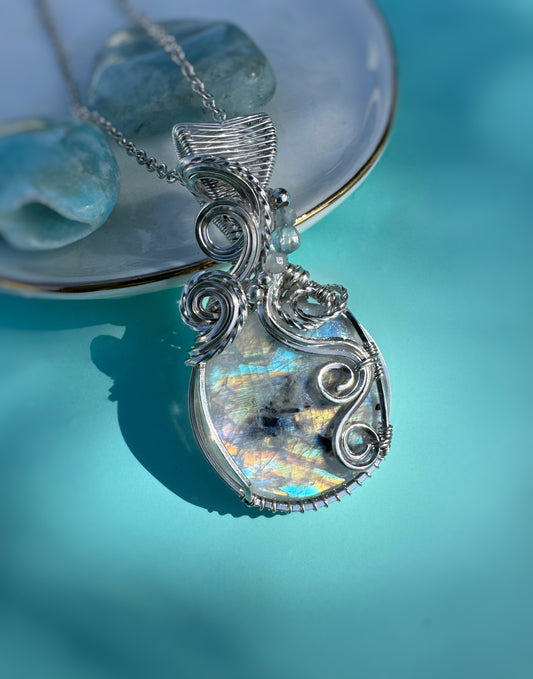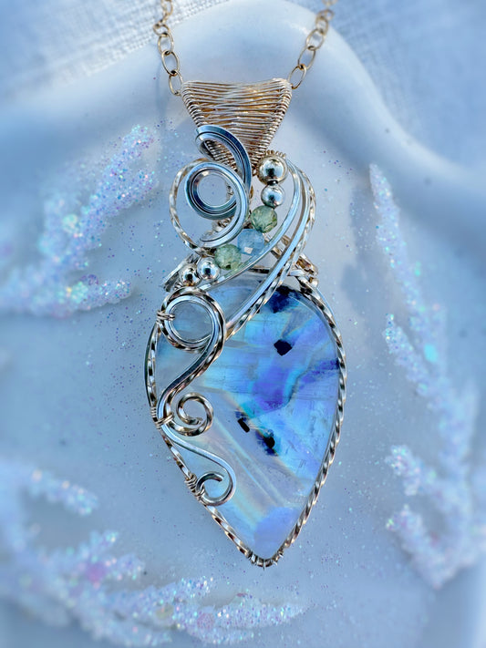 Rainbow Moonstone & Aquamarine Necklace in Argentium Silver