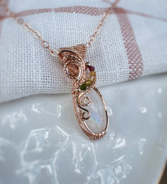 Rainbow Moonstone & Mixed Tourmaline Necklace in 14K Rose Gold Filled