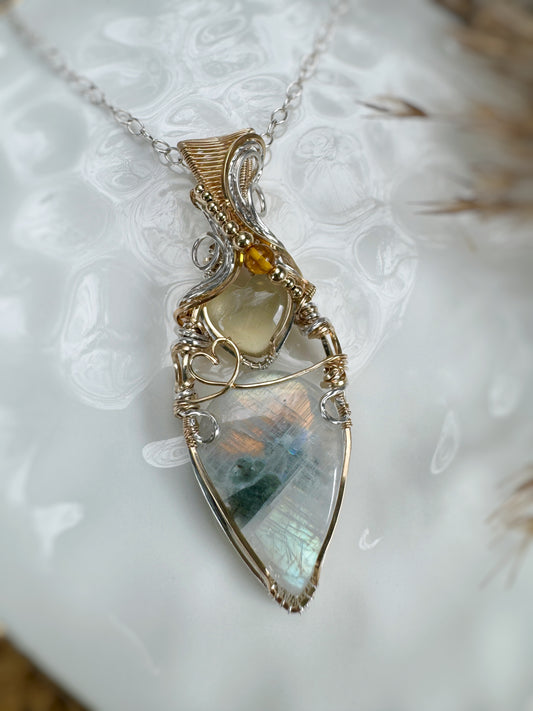 Rainbow Moonstone, Citrine Heart & Amber Necklace in 14k Gold Filled & 0.925 Sterling Silver