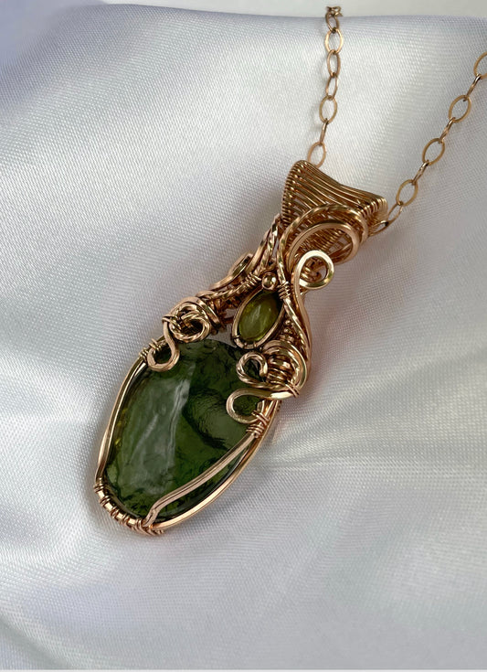 Rare Moldavite (from the Czech Republic), Peridot Necklace in 14k Rose Gold Filled