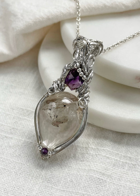 Rare Enhydro Quartz, Amethyst Necklace in 0.925 Sterling Silver