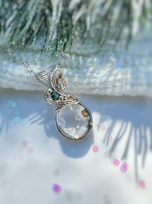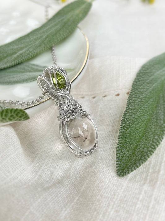 Rare Enhydro Quartz, Peridot & Herkimer Diamond Necklace in Argentium Silver