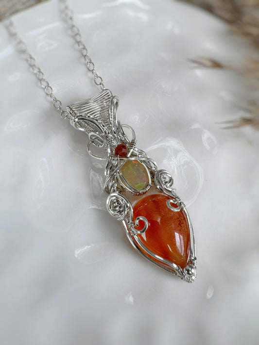 Carnelian, Opal & Hessonite Garnet Necklace in 0.925 Sterling Silver