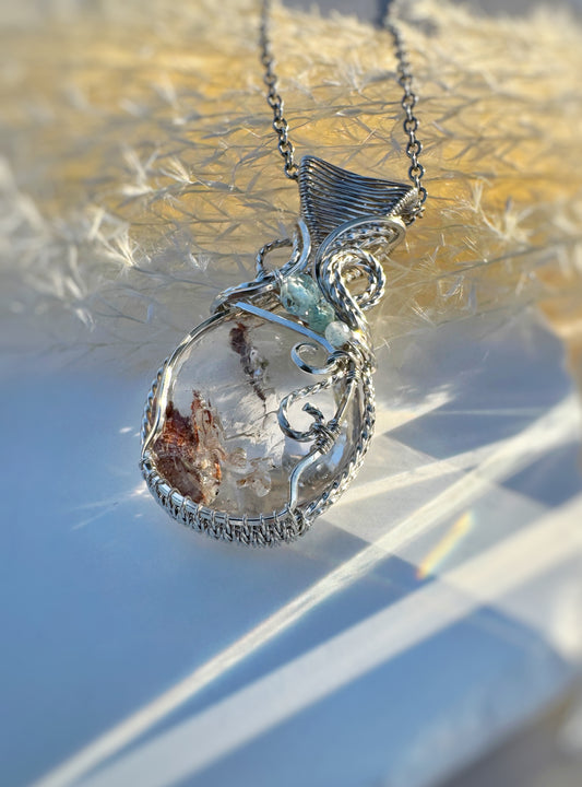 Rare Enhydro Quartz, Aquamarine, Aqua Kyanite Argentium Silver Necklace