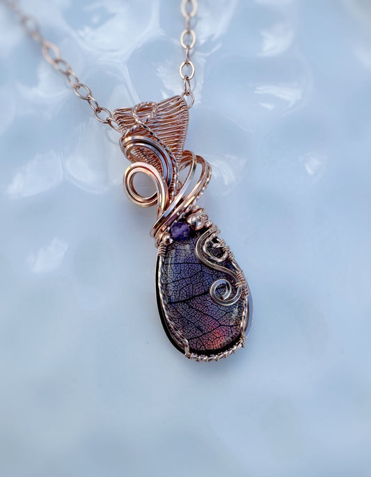 Aurora Opal with Real Vein Skeletons of a Leaf (Glass Top) & Amethyst Necklace in 14k Rose Gold Filled