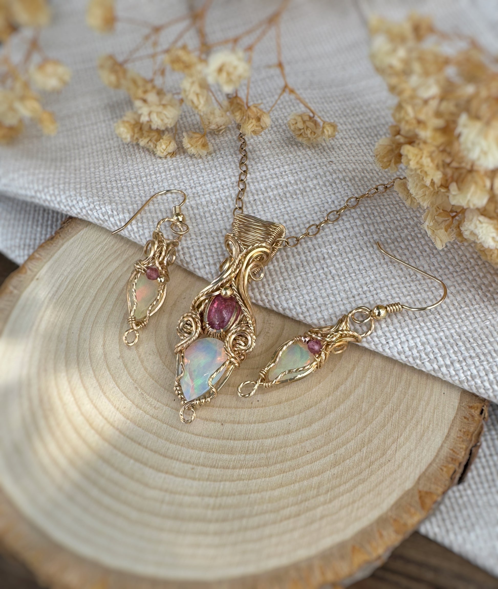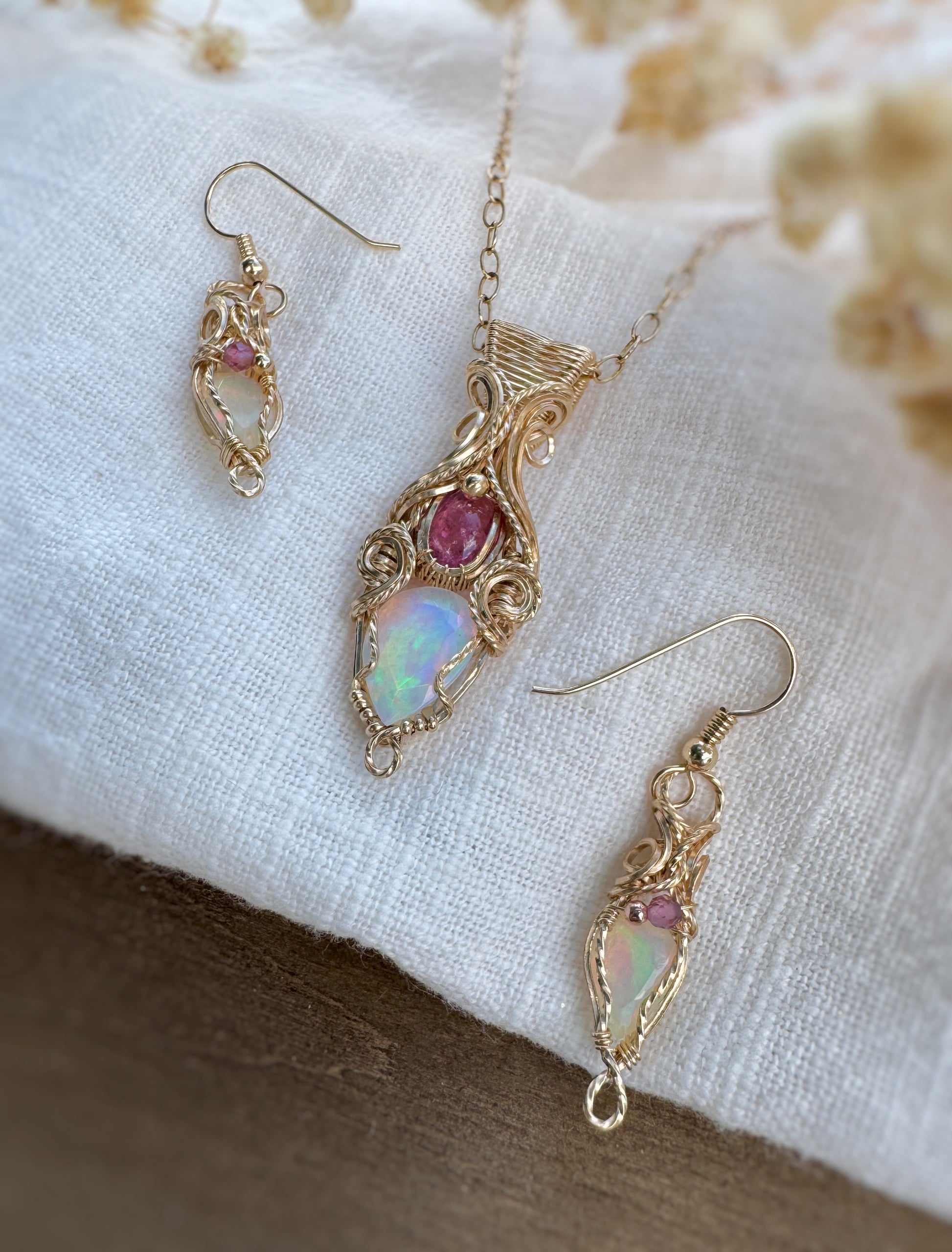 2.35 Ct Opal & Pink Tourmaline set (Earrings & Pendant) in 14k Gold Filled