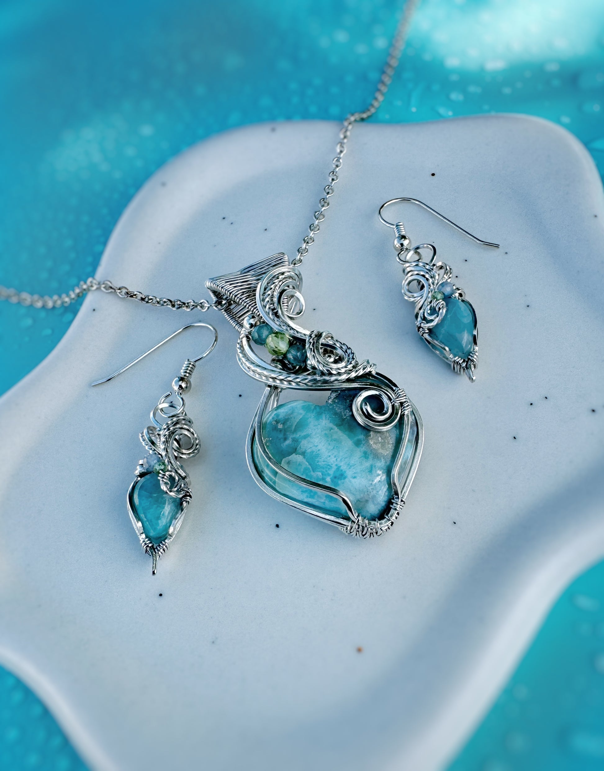 Larimar, Aquamarine & Peridot Set in Argentium Silver (Necklace & Earrings)