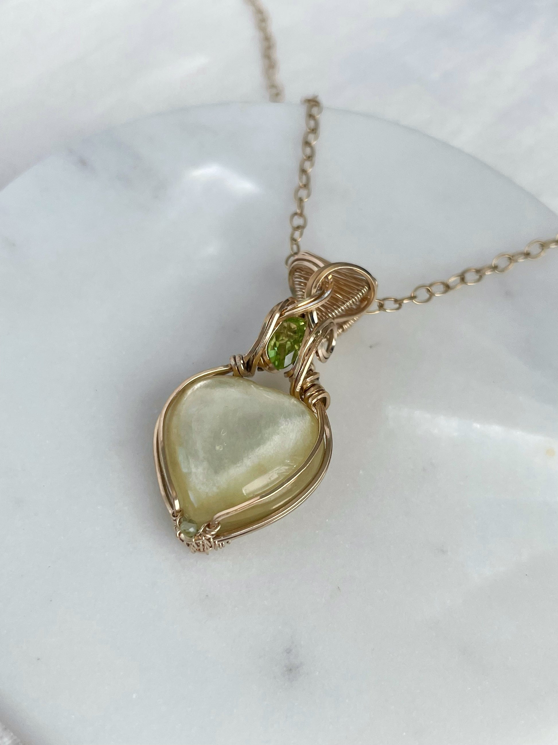 Mini Muscovite Heart & Peridot Necklace in 14k Gold Filled