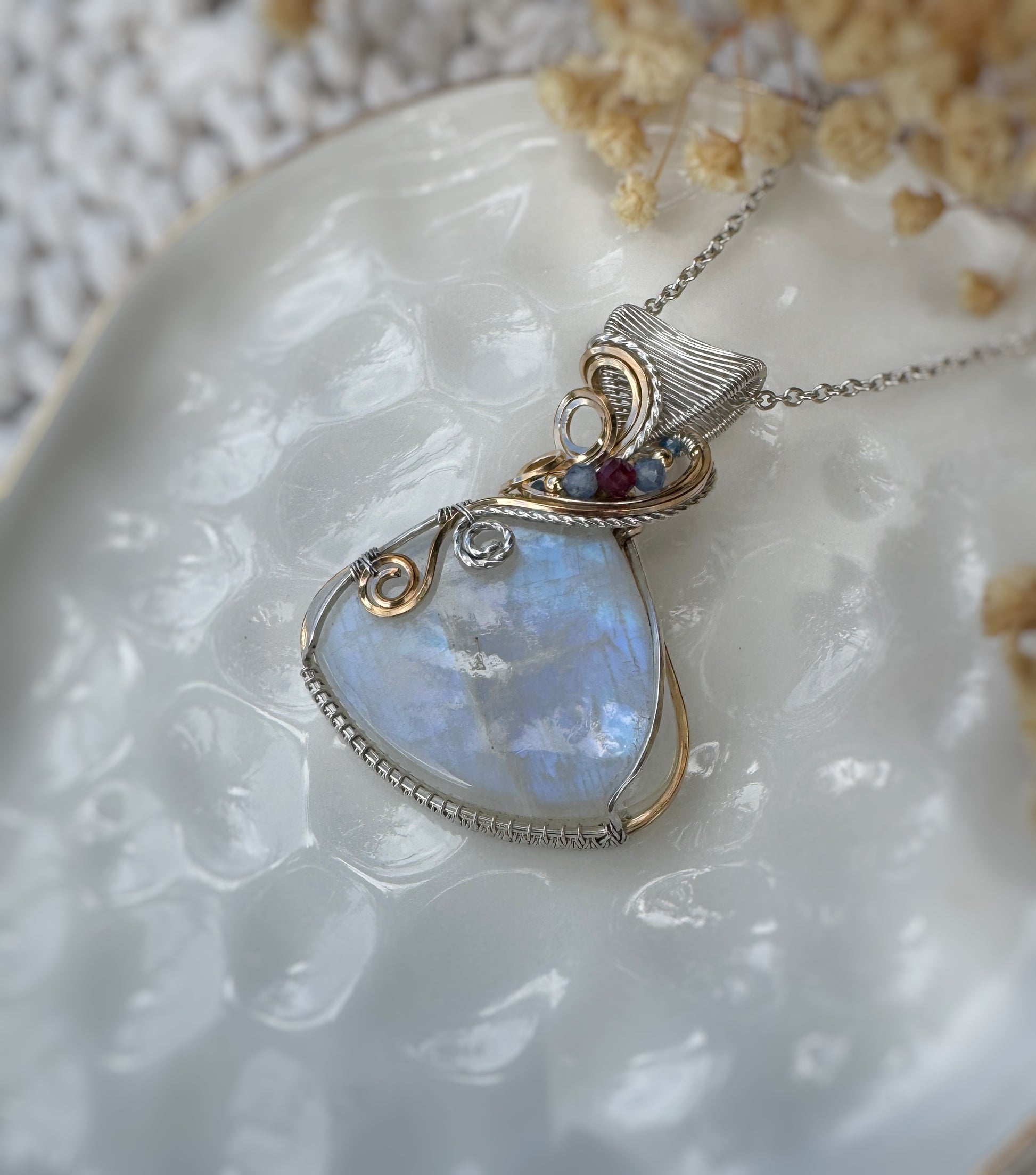 Moonstone, Red/Pink Rubellite, Blue Kyanite necklace in mixed metals (14k Gold Filled & Argentium Silver)