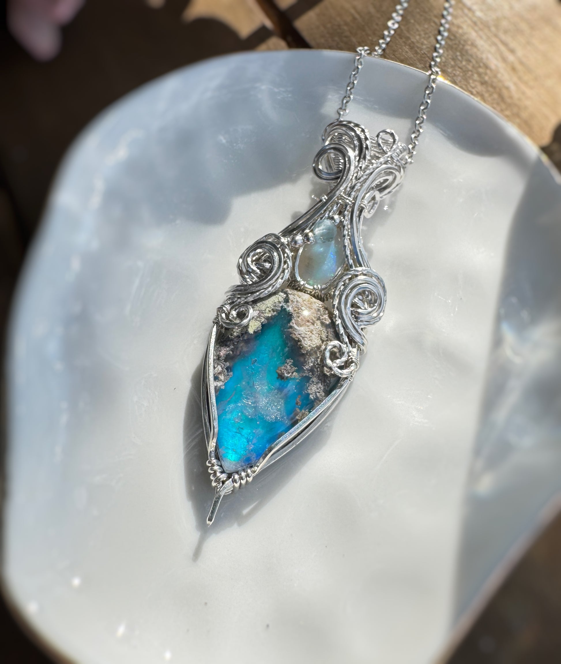 Moss Agate (Doublet), Opal & Aquamarine Necklace in 0.925 Sterling Silver