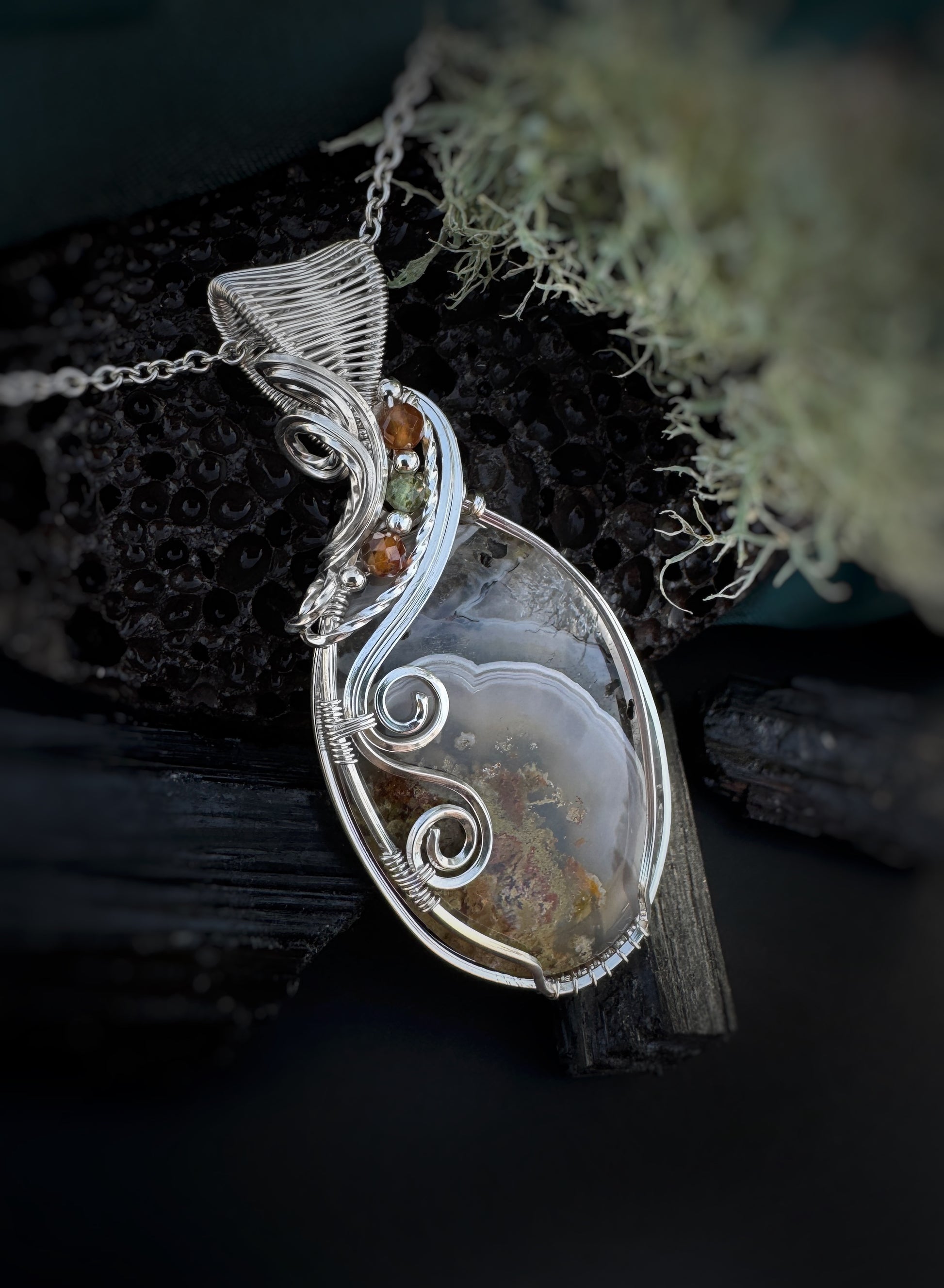 Moss Agate, Hessonite Garnet & Green Apatite Necklace in Argentium Silver
