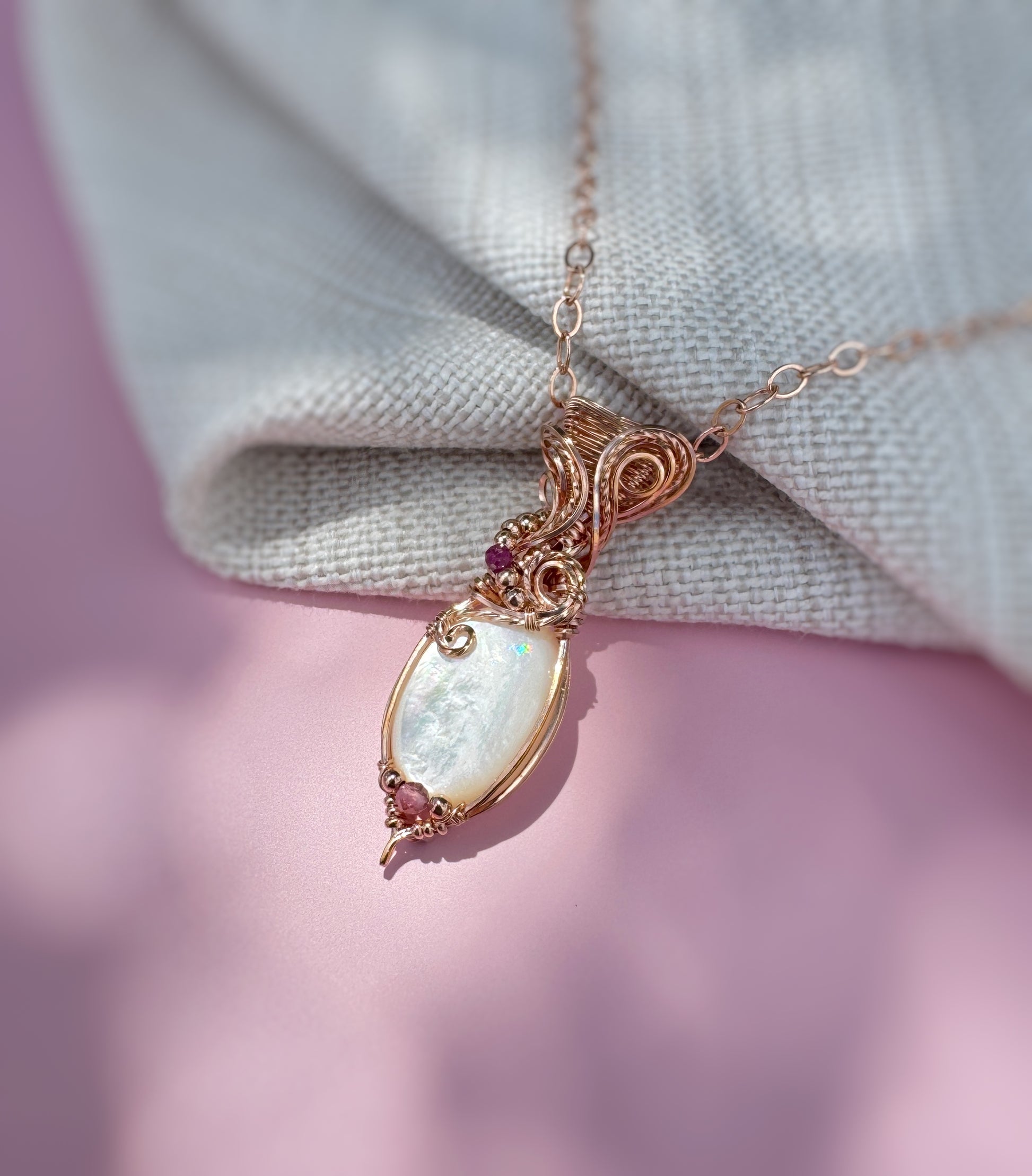 Pearl, Ruby & Pink Tourmaline Necklace in 14k Rose Gold Filled