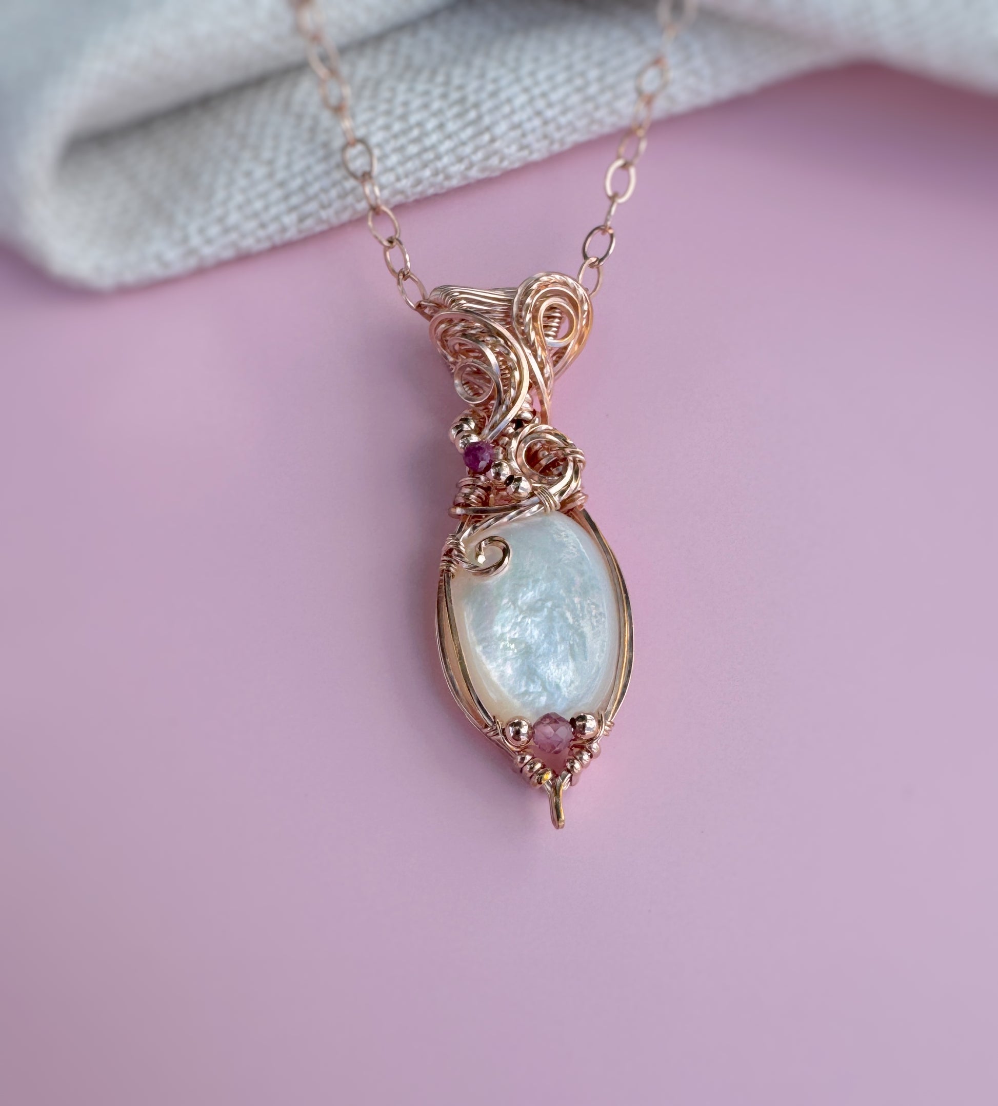 Pearl offers a gentle energy of wisdom and calm. Ruby adds passion and vitality, while pink tourmaline softens and soothes the heart space.