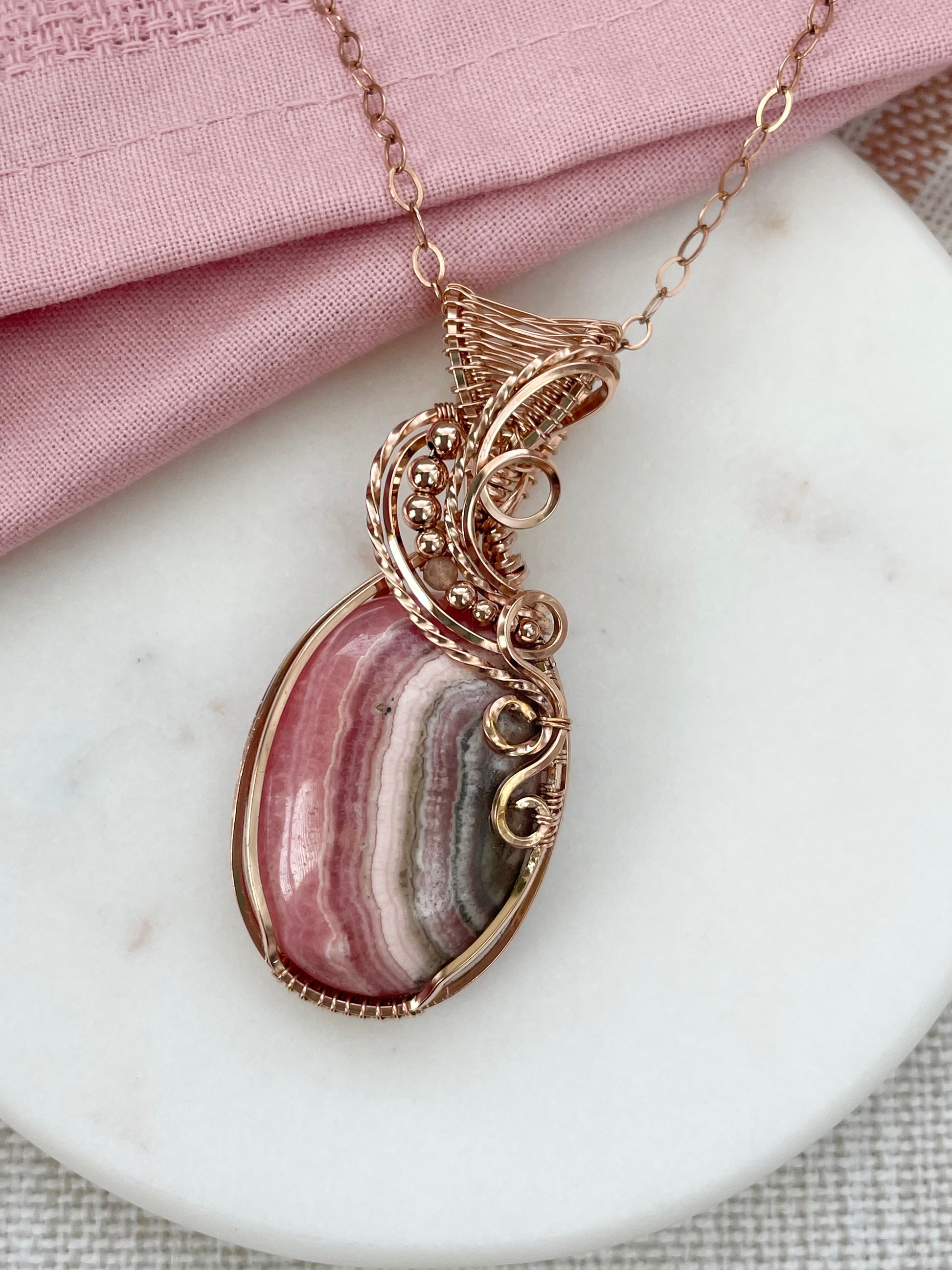 RHODOCHROSITE: It's a stone for emotional healing, and encourages the release of past traumas and nurturing self love and compassion. It is also associated with prompting a positive outlook, inner piece, and personal growth.